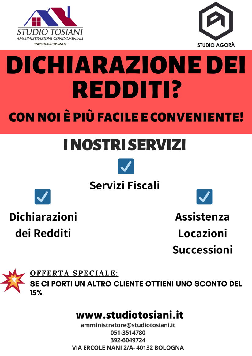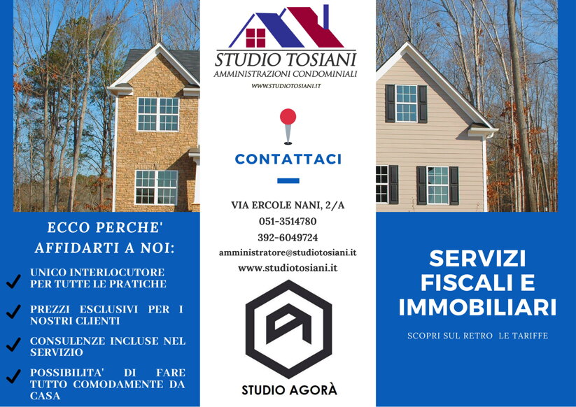 Dott. Angelo Tosiani Amministrazioni Condominiali e Immobiliari Iscrizione ANACI n.17135 – P.Iva 03594441200 Professione esercitata ai sensi della legge 14 gennaio 2013, n.4 (G.U. n.22 del 26-1-2013). Il materiale fotografico che trovate sul sito è stato personalmente realizzato dal sottoscritto o reperito sul sito https://photo.aptservizi.com/